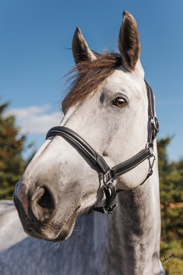Experience the perfect blend of durability and elegance with our premium leather padded headcollar. Crafted from high-quality leather, this headcollar offers both style and strength, whether you're looking to elevate your everyday look or shine at the show. Featuring an anatomically shaped headpiece, it ensures optimal comfort for your horse, making it the ideal choice for both everyday use and special occasions.